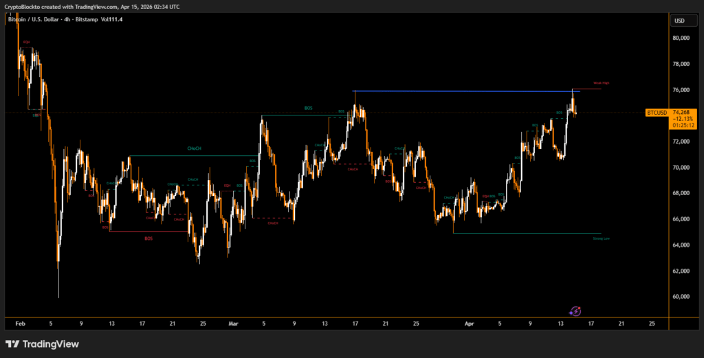Bitcoin briefly moved above the $76,000 resistance level but failed to maintain momentum, reversing below $74,000 during the same session. The move highlights a continued two-month struggle to secure a decisive breakout above key resistance zones. Despite the rejection, Bitcoin still recorded about a 1.3% daily gain, trading near $74,300.