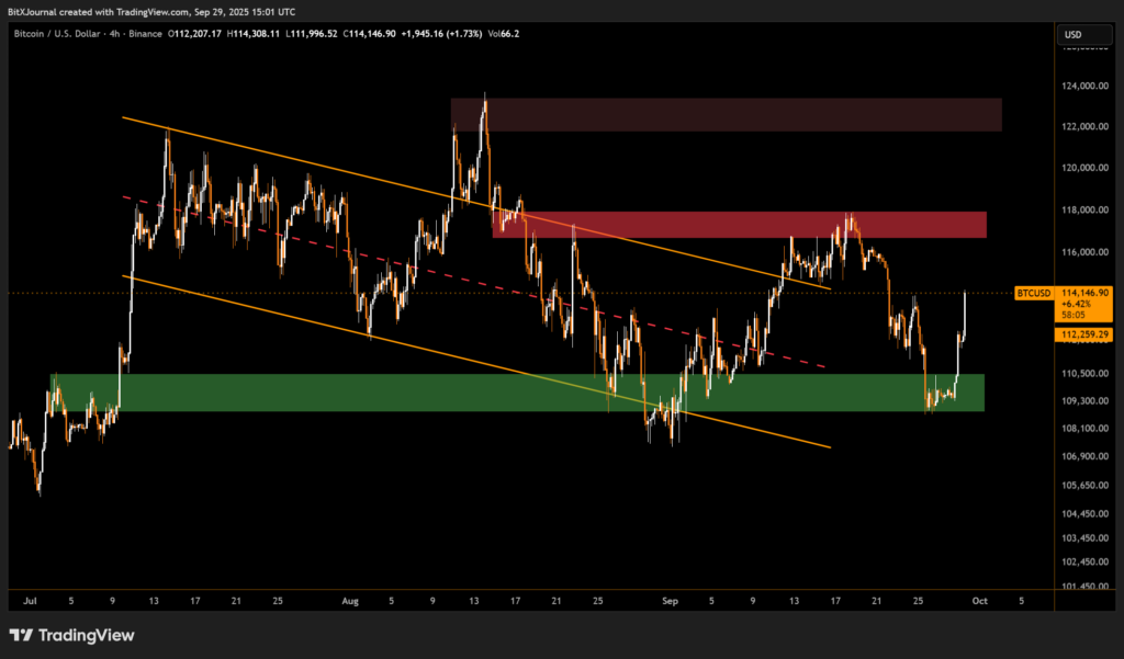 The chart shows Bitcoin reclaiming the upper boundary of the descending channel that had capped price action through August and September. The decisive move above $114K suggests momentum is shifting back in favor of bulls.