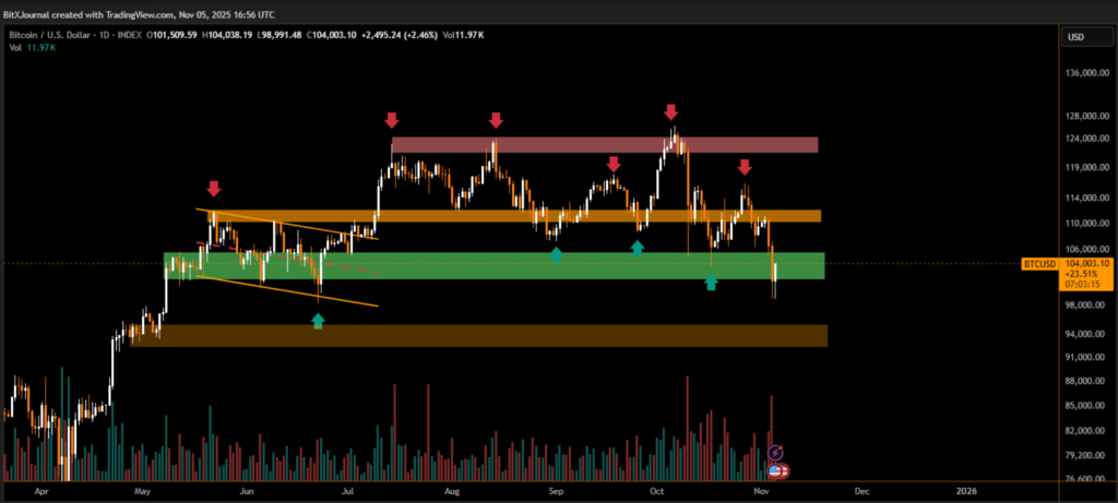 “Bitcoin’s ability to hold above $100,000 and reclaim $104,000 suggests the correction may have reached exhaustion. A sustained close above $106,000 could reignite momentum toward $110,000–$114,000 resistance,” noted one BitXJournal technical analyst tracking large-volume flows.
