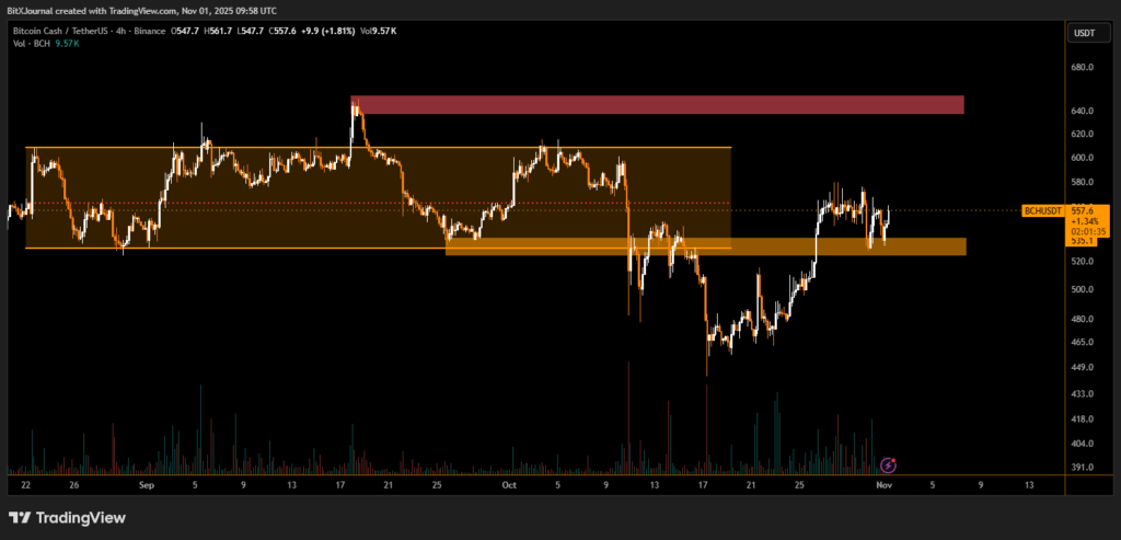 At the time of writing, BCH trades near $557.9, up 1.86% on the session. Market sentiment remains cautious as participants monitor whether the recent breakout sustains above intraday support levels or fades back into the previous range.