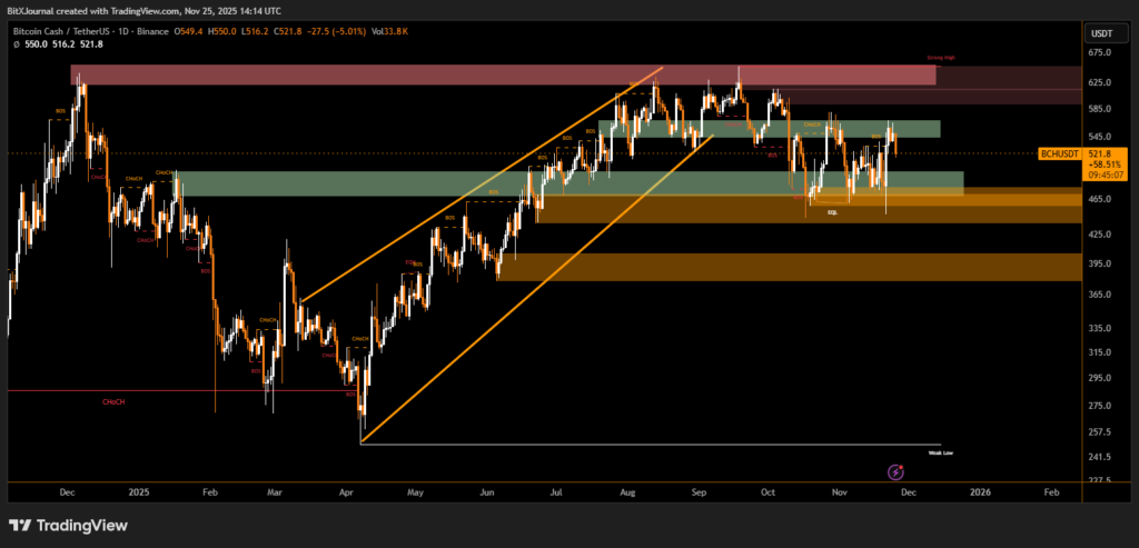 The chart reveals several critical zones. The green demand region around $500–$470 remains the main short-term buffer. BCH tapped this area twice in recent weeks, each time producing a strong rebound.