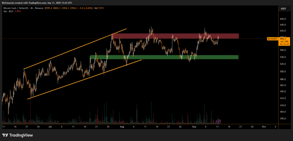 The 4-hour BCH/USDT chart shows that the token has been trading within a well-defined range after breaking out of an ascending channel in early August. Price action remains supported around the $545–$555 green zone, which has acted as a base for multiple rebounds.