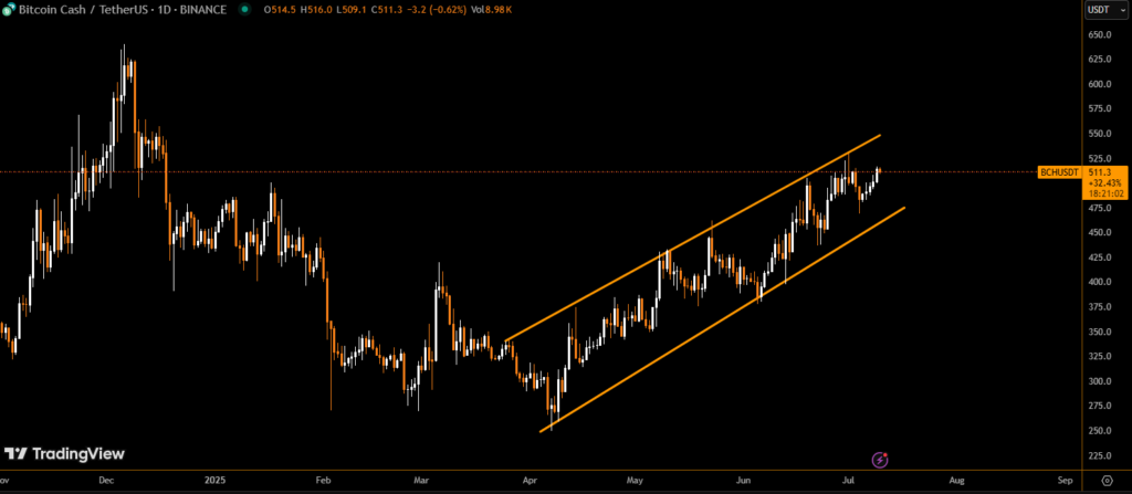 Holding above $505 will be crucial in the near term, as a breakdown below this level could trigger profit-taking. However, as long as BCH maintains its base above the psychological $500 mark, the technical outlook remains favorable.