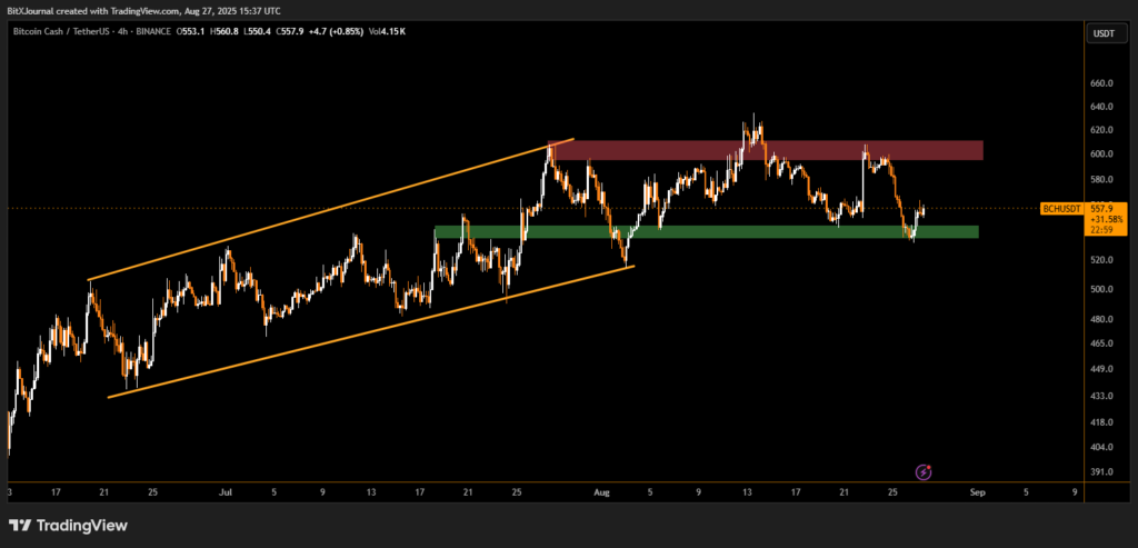 The chart indicates BCH has rebounded strongly from the green demand zone near $540, preventing further downside pressure. This rebound comes after the asset briefly slipped below its rising channel that supported price action through July and early August.