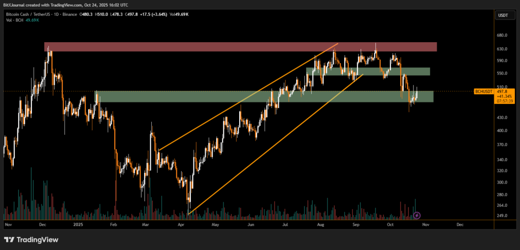 Bitcoin Cash (BCH) rose nearly 5% in the last 24 hours, trading around $498 after a notable rebound from a major support zone near $480. The recovery comes after several sessions of heavy selling that pushed the cryptocurrency to a one-month low, raising concerns of a deeper correction.