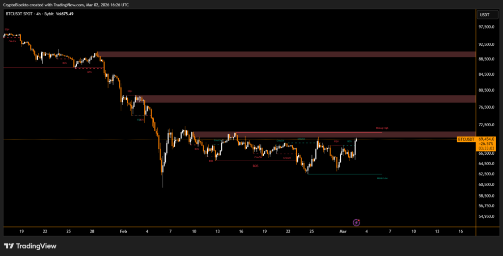 Economic data added another layer to the market narrative. February’s ISM manufacturing PMI rose to 52.4, marking continued expansion and reinforcing signs of accelerating U.S. economic activity. Stronger data and rising oil prices have reduced expectations of a near-term rate cut from the Federal Reserve, yet bitcoin’s advance suggests investors may have already priced in tighter monetary conditions.