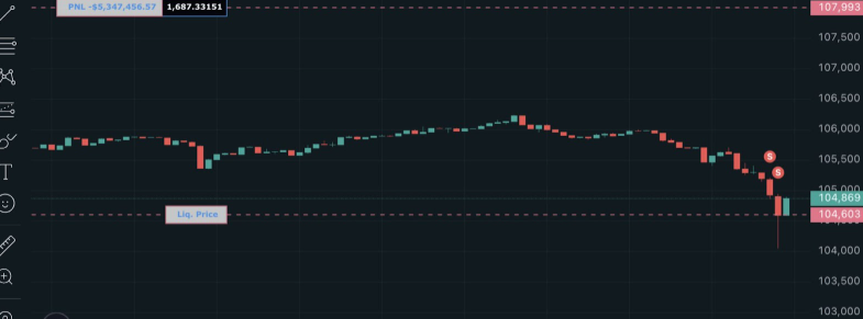 - 421.8 BTC (worth $43.9 million) was liquidated as BTC dropped to $104,150