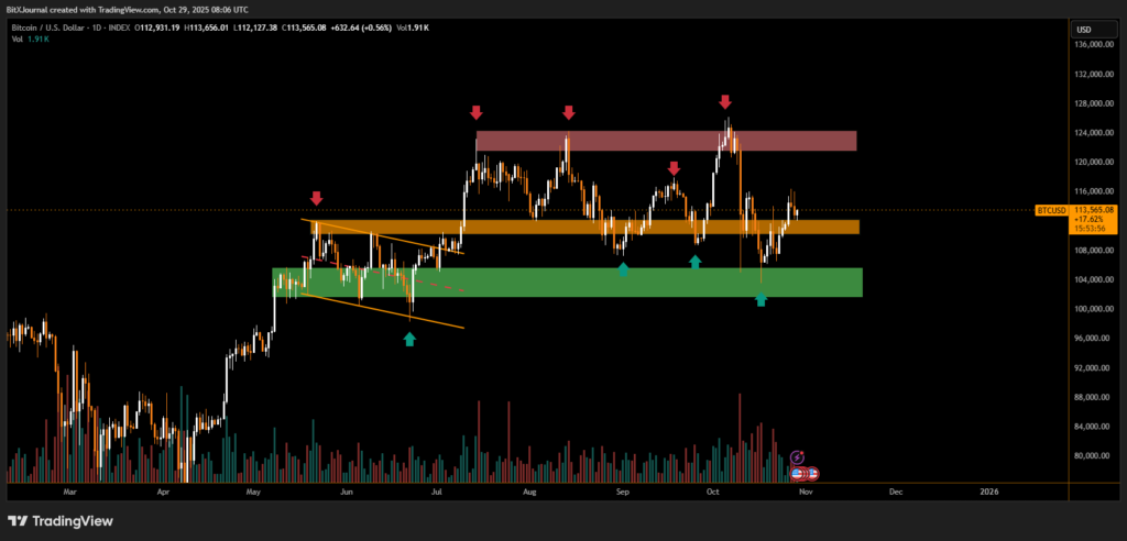 Bitcoin (BTC) traded near $113,000 on Wednesday, consolidating after a brief rally toward $116,000 faded, as investors awaited the Federal Open Market Committee (FOMC) decision later today. Despite the short-term pullback, analysts say the move looks like a standard pre-FOMC dip, not a breakdown, and that clearing $120,000 could pave the way toward $143,000 in the coming weeks.