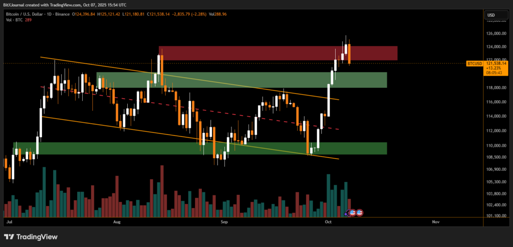 On the daily BTC/USD chart, Bitcoin is showing a clear rejection from the $124,000–$125,000 resistance zone, a level that coincides with previous highs and institutional selling pressure. The red zone on the chart marks an area where bulls have repeatedly struggled to gain traction, prompting a short-term correction after the sharp vertical rise in late September.
