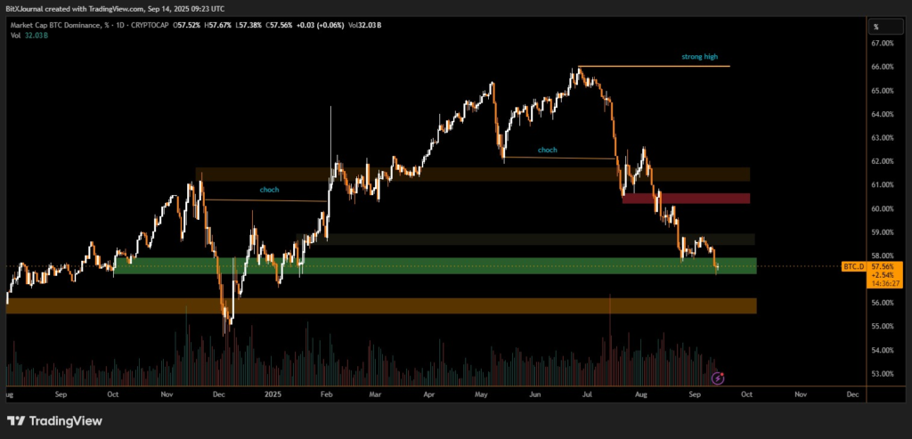 The chart highlights a clear downtrend in dominance from the June peak above 66%, with successive lower highs confirming weakening momentum. Currently, BTC dominance is holding near the green demand zone around 57%, a level that previously served as a launchpad for Bitcoin’s recovery earlier this year.