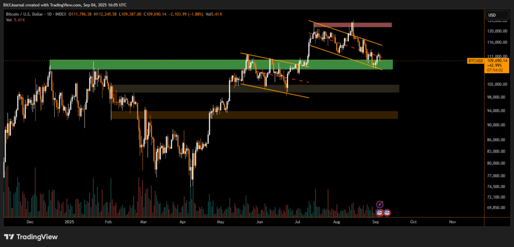 Bitcoin (BTC) fell back toward the $109,000 support level this week, raising questions about whether the world’s largest cryptocurrency can hold its ground amid ongoing market uncertainty. The decline comes after repeated failures to reclaim the $118,000–$120,000 resistance area, which continues to act as a significant barrier for buyers.