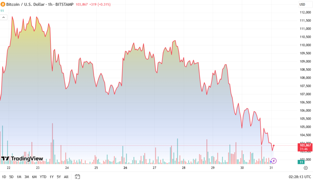 The cryptocurrency market faced a significant downturn on Friday as renewed tensions between the U.S. and China reignited fears among investors. Bitcoin fell 2.1%, slipping below $104,000, triggering widespread losses across both digital assets and traditional markets.