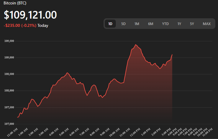 Bitcoin (BTC) slipped below $109,000, hitting an intraday low of $107,160 before a slight recovery to $109,121.