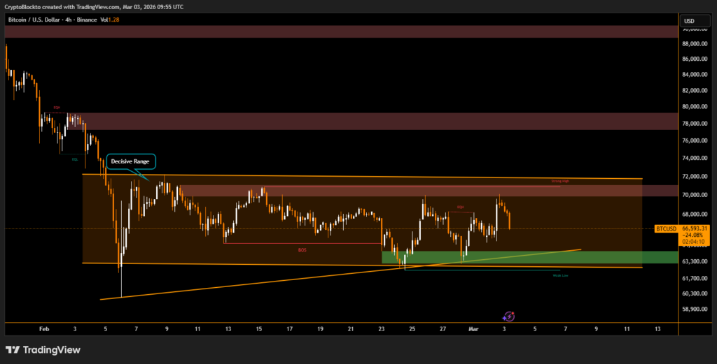 Bitcoin slipped below $67,000 on Tuesday as investors shifted toward defensive assets amid escalating geopolitical tensions in the Middle East. The leading cryptocurrency declined roughly 3% over the past 24 hours, retreating after briefly testing the $70,000 level at the start of the week.