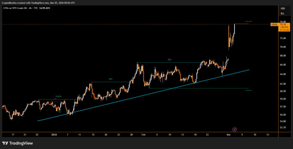 The pullback coincides with a broader risk-off move across financial markets. The U.S. dollar strengthened sharply, with the DXY index climbing above 99, its highest level since late January. At the same time, the benchmark 10-year U.S. Treasury yield moved toward 4.1%, signaling sustained pressure from elevated interest rate expectations.