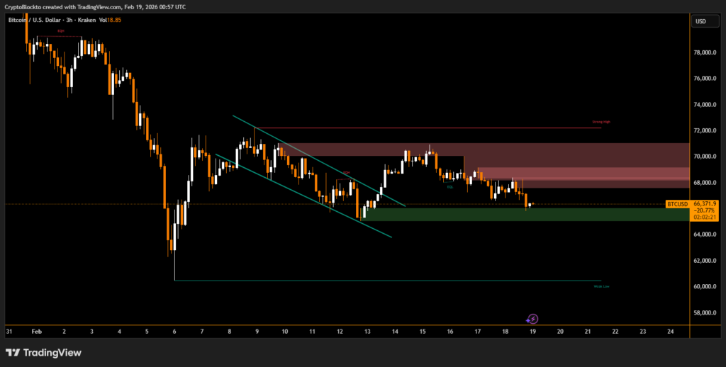 The decline puts bitcoin on pace for its fifth consecutive weekly loss its longest negative streak since the 2022 bear market. The $66,000 zone previously acted as support, helping spark a rebound above $70,000. A decisive break below that level could expose the early February lows near $60,000.