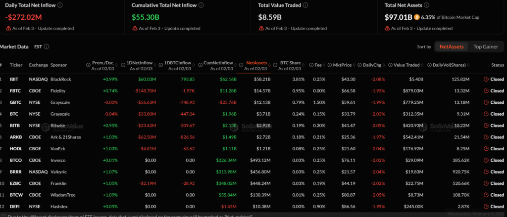 Assets under management for spot Bitcoin exchange-traded funds have slipped below the $100 billion mark following $272 million in net outflows. This is the first time ETF assets have fallen under this level since April 2025, highlighting growing pressure across digital asset markets.
