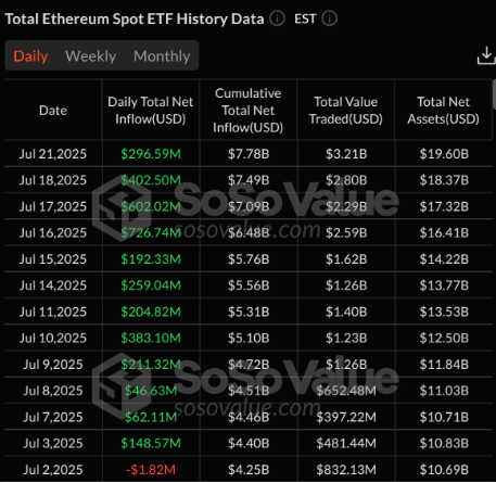 While Bitcoin ETFs paused, Ethereum spot ETFs extended their inflow streak with another $296.59 million in net inflows on Monday. The 12-day run has now pushed total ETH ETF inflows to $7.78 billion.