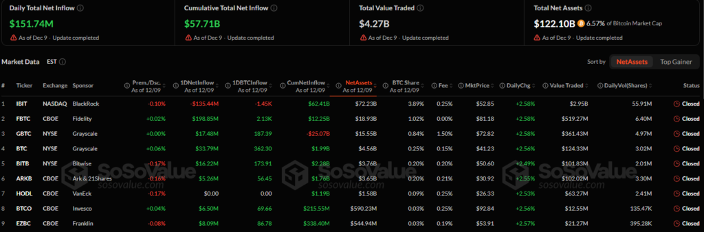 Bitcoin exchange-traded funds (ETFs) recorded a notable rebound on Tuesday, attracting $152 million in net inflows ahead of the Federal Reserve’s final policy decision of 2025. The surge was led by Fidelity’s FBTC fund, which alone drew $199 million, reversing several days of prior weakness. Ethereum and Solana ETFs also posted gains, with Ethereum adding $178 million and Solana $16.5 million in inflows.