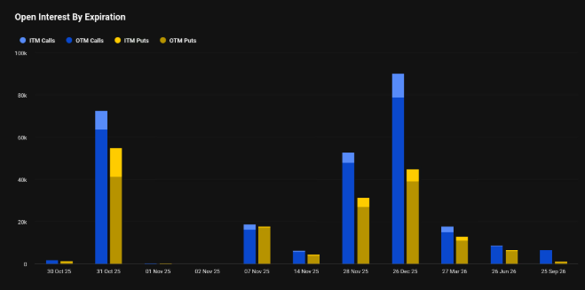 Out-of-the-money (OTM) options account for over 82% of open interest, showing traders’ preference for speculative, leveraged positions rather than simple hedges. Calls are concentrated near $120,000 and $130,000, while puts cluster around $100,000 and $110,000 — indicating expectations for a potential wide price range after expiry.
