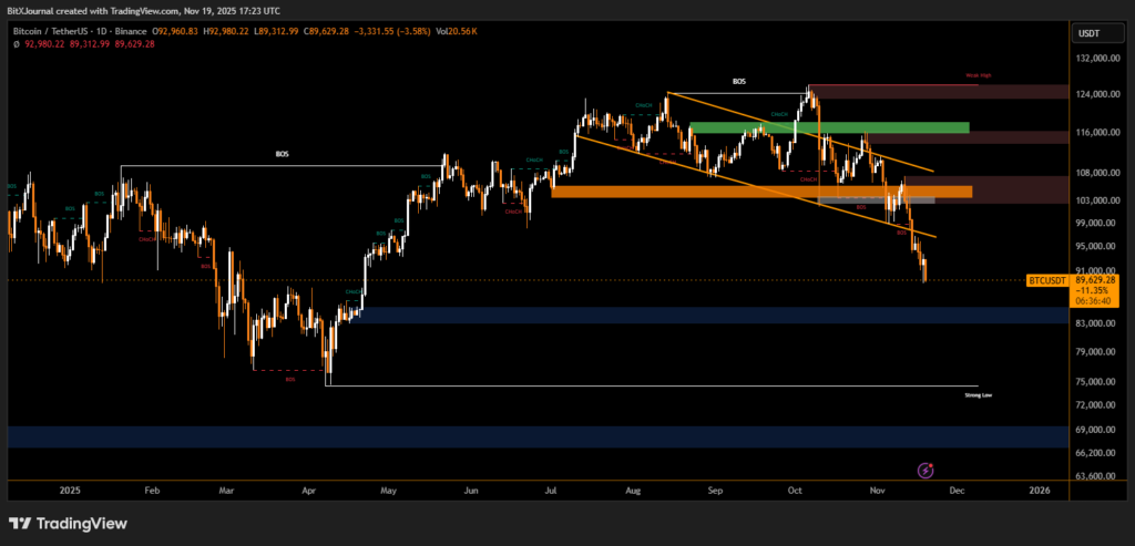 “The market is following a clear pattern of lower highs and lower lows, and the recent BOS confirms the continuation of the downtrend,” said BitXJournal technical analyst tracking liquidity flows. “If current weakness continues, the next major reaction zone sits in the mid-$80,000 range.”