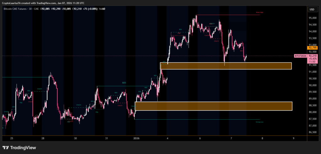 A recent weekend gap formed after CME Bitcoin futures closed near $90,600 on Friday and reopened around $91,600 on Sunday. This leaves an untraded price range just below current levels, making $90,600 and $88,000 significant downside reference points. Historically, gaps tend to be filled within days, though some remain open longer, creating self-reinforcing technical gravity that influences trader behavior.