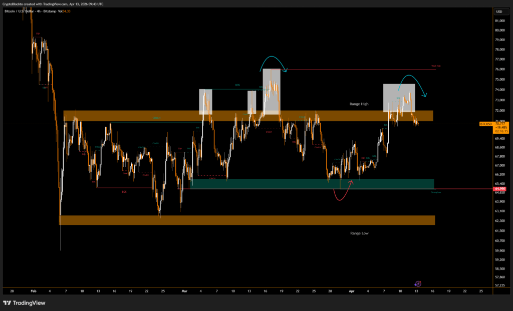 Market behavior indicates that the $70,000–$80,000 range has evolved into a persistent distribution zone since February. Instead of buyers driving prices higher, many existing holders are using rallies as opportunities to lock in gains, leading to rapid pullbacks after each upward move.