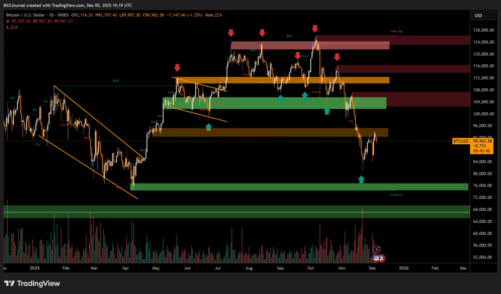 The current market structure shows Bitcoin retreating from a dense cluster of supply between $112,000 and $120,000, an area that has repeatedly acted as a ceiling throughout the year. Multiple rejections marked by consecutive swing highs reinforce the importance of this region, where liquidity has consistently been absorbed by sellers.