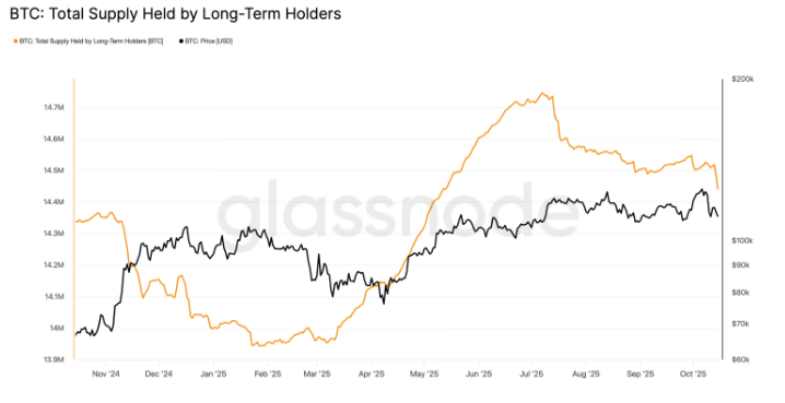Bitcoin (BTC) is facing renewed selling pressure, even as the market enters what is usually a seasonally bullish phase. The world’s largest cryptocurrency continues to hover around $110,000, struggling to regain momentum amid heavy distribution from long-term holders (LTHs) and large whale investors.