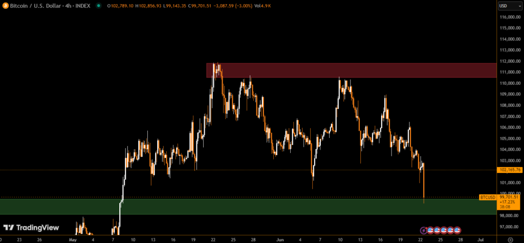 Bitcoin (BTC) dropped below the $100,000 mark on Sunday, hitting its lowest price since May, as escalating geopolitical tensions involving Iran triggered a risk-off sentiment across Wall Street. This dip, fueled by concerns over a potential closure of the Strait of Hormuz, also dragged major altcoins like Ethereum (ETH), XRP, and Solana (SOL) into the red.