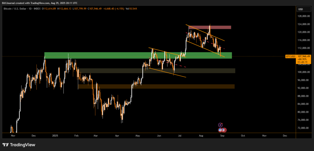 The chart indicates that BTC recently rejected from the $122,000 resistance zone, forming a descending channel pattern. This pullback has pushed the price back into the $108K–$110K support area, a critical region that traders consider a line of defense for bulls.