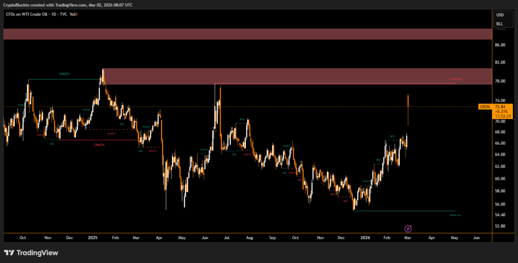 At the same time, U.S. stock index futures turned sharply lower. S&P 500 e-mini futures declined around 1.4%, reversing earlier advances, while crude oil prices surged more than 7% amid fears of supply disruptions.