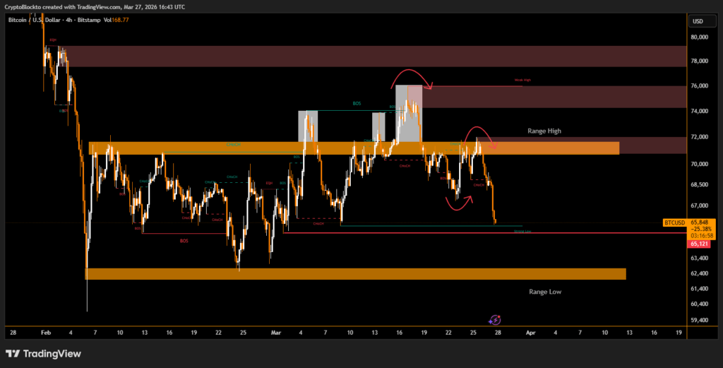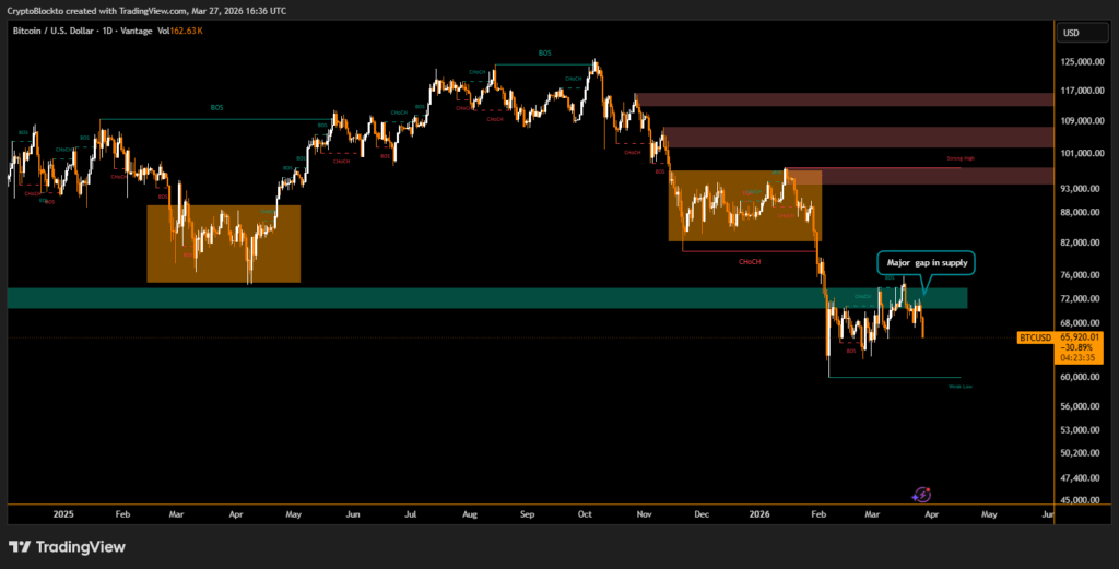 Market analysts identified $70,000 as a key resistance level after Bitcoin lost support near $68,000. Technical patterns indicate a possible move toward the $64,000–$65,000 demand zone unless price strength returns above resistance levels.
