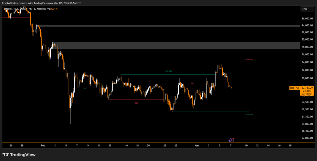 The price of Bitcoin moved lower heading into the weekend, slipping below $68,000 after briefly climbing to nearly $74,000 earlier in the week. The digital asset declined about 3.4% over the past 24 hours, continuing a pattern in recent months where late-week selling pushes prices toward the lower end of its trading range.
