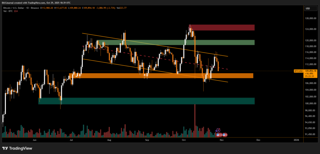 The latest daily chart shows BTC retracing from the $113,500 intraday high, slipping back into the orange support band near $108K, which has served as a pivotal zone for both buyers and sellers since mid-year. The formation of a descending channel—outlined by parallel yellow trendlines—suggests Bitcoin remains under short-term bearish pressure after failing to sustain momentum above the mid-range resistance near $118K.