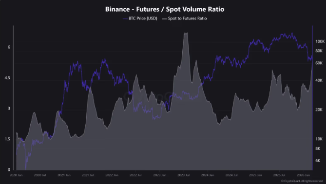 Bitcoin futures trading on Binance has grown to over five times the volume of spot trading, with the futures to-spot ratio reaching 5.1, the highest since mid-2023. This shift indicates a structural change in market behavior, where leveraged positions increasingly drive price movements rather than traditional buying and selling.