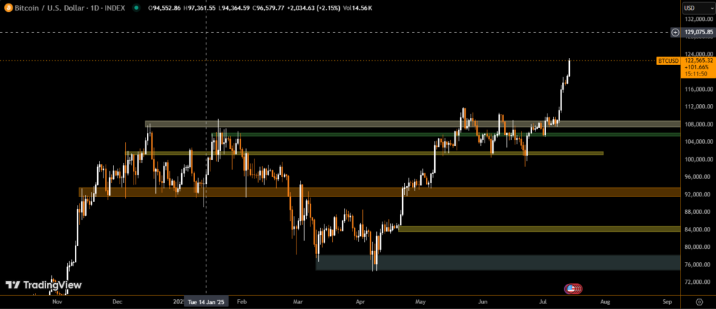 Bitcoin (BTC) has surged above $123,000, marking a new all-time high and overtaking gold as the best-performing asset of 2025. With year-to-date gains of approximately 30%, Bitcoin has edged past gold’s 27% return, signaling a major shift in capital flows amid global instability.