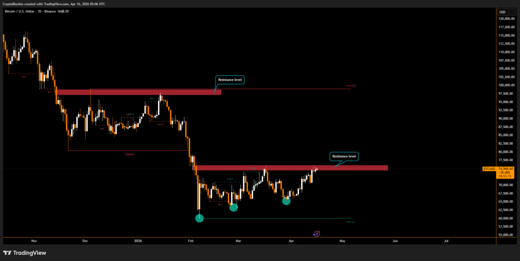 Bitcoin traded near $74,944 as U.S. equities reached record levels, with the S&P 500 gaining 0.8% and the Nasdaq 100 rising 1.4%. Markets reacted to reports of an in-principle U.S.–Iran agreement to extend cease-fire talks beyond the April 7 deadline, easing short-term geopolitical concerns.