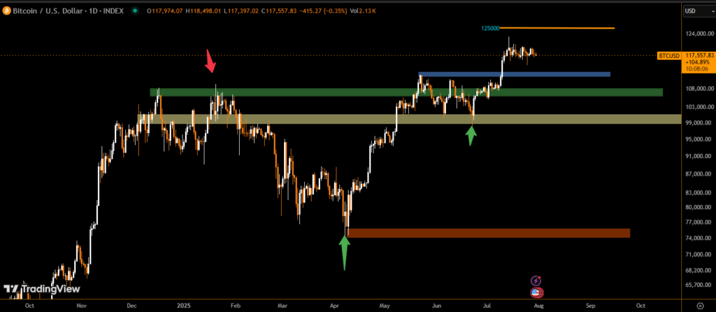 Bitcoin (BTC) traded cautiously below $118,000 as the U.S. Dollar Index (DXY) surged to a five-week high following robust economic data. The DXY climbed to 99.34, its strongest level since June 23, driven by better-than-expected GDP growth and resilient consumer spending.