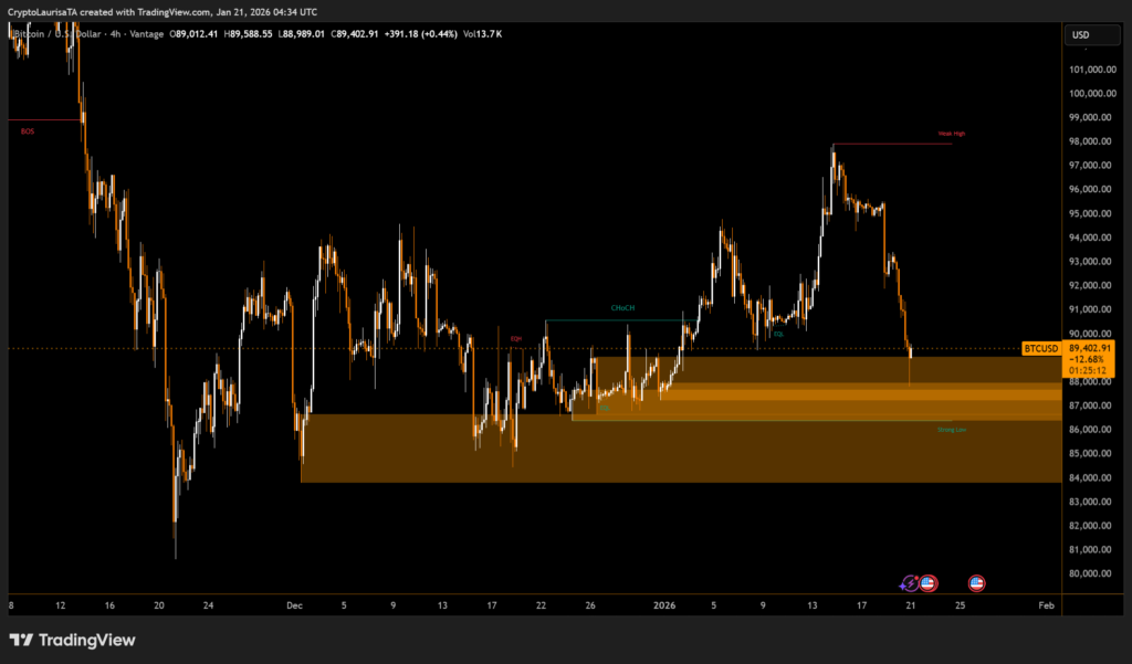 Bitcoin fell nearly 4% in a single session, reaching around $87,790, its lowest level since late December. Over the past week, the asset is down approximately 10%, wiping out all gains accumulated earlier this year. Notably, Bitcoin slipped below its 50-day exponential moving average, a technical level that previously supported its upward momentum.