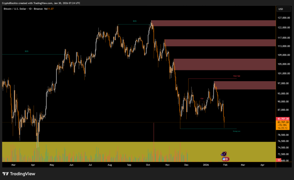 Bitcoin has declined roughly 6% over the past month and is down nearly 8% over the last seven days, trading around $82,800. Relative to the stock market, Bitcoin continues to lose ground, reflecting waning risk appetite across digital assets. Broader sentiment indicators remain subdued, with investor confidence showing signs of extreme caution.