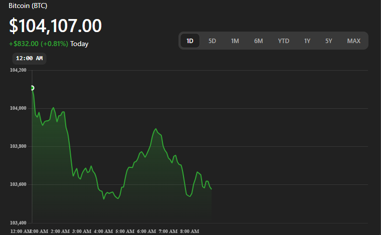 As of May 14, 2025, Bitcoin is trading at approximately $103,591, with an intraday high of $104,836 and a low of $102,722. The psychological $100,000 level has acted as a solid support zone during recent volatility.