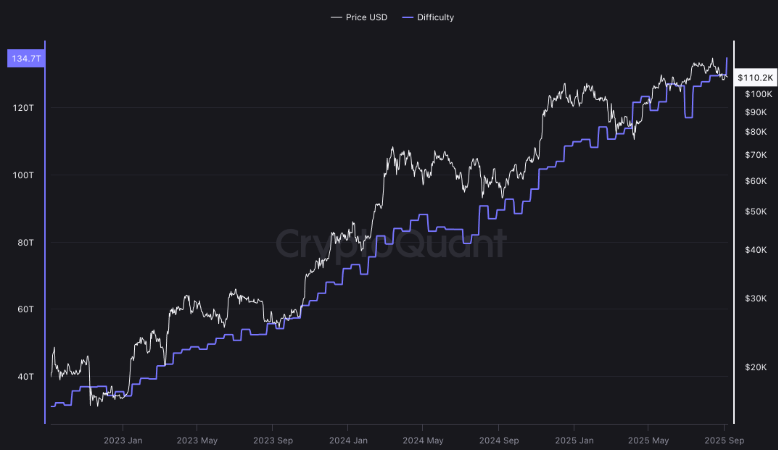 Mining difficulty, which measures how hard it is to validate a new block, previously peaked in August and has continued rising since then. According to data from CryptoQuant, Bitcoin’s hashrate has slipped to 967 billion hashes per second, down from the record 1 trillion hashes per second recorded on August 4.