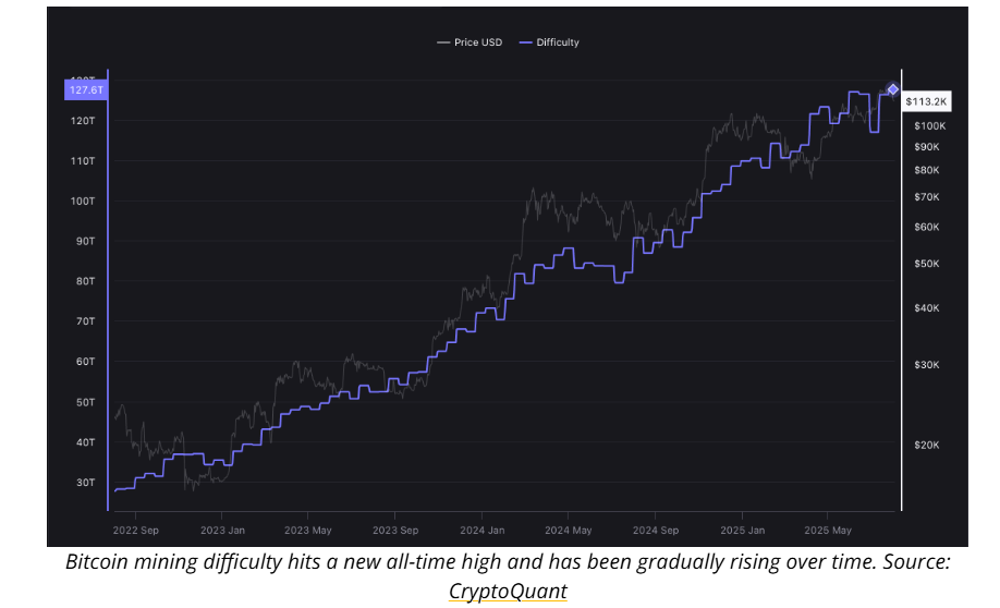 This ATH comes amid continued growth in Bitcoin’s hashrate, which reflects the total computational power securing the network. While a rising hashrate signals network strength and miner commitment, it also reduces miner profitability due to higher competition.