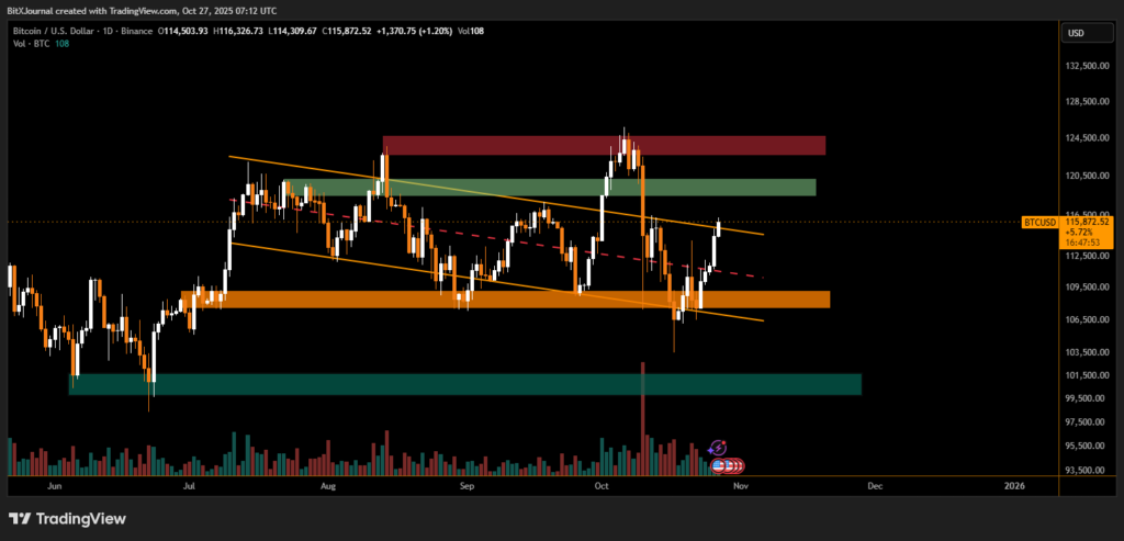 Bitcoin (BTC) is once again testing investor patience — and optimism — as the world’s largest cryptocurrency surged past $116,000, marking its highest point in nearly a month. Technical indicators suggest that BTC is on the verge of breaking out of a descending channel that has contained prices since early August.