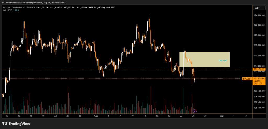 Bitcoin (BTC) started the week with a notable CME gap as futures markets opened, drawing attention from traders who closely monitor these imbalances. At the time of writing, BTC trades around $111,642, after dipping from the $116,000 zone.