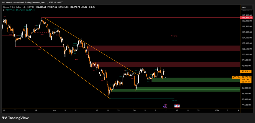 Overhead, BTC faces layered resistance near 92,500 USD, followed by broader supply zones around 97,000–102,000 USD. These regions remain significant caps on upward momentum and align with prior breakdown levels that fueled the current sell-off. Unless Bitcoin can reclaim these areas with convincing volume, bullish continuation will remain limited.