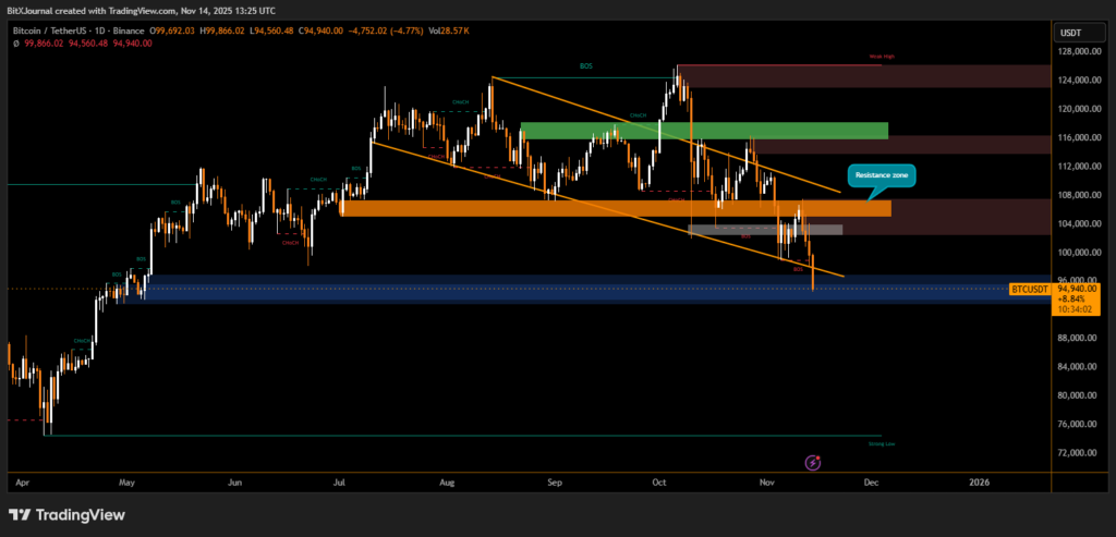 Bitcoin’s decline pushed price directly into a high-volume demand region highlighted on the charts. The asset has been trading inside a descending channel since early September, repeatedly rejecting its upper boundary. The most recent breakdown carried BTC into a wide liquidity pocket between 94,000 and 96,000.
