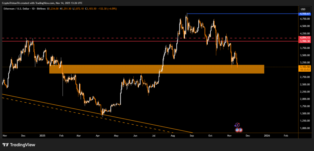 ETH mirrored Bitcoin’s weakness, dropping toward 3,000 USD, a level that previously served as a springboard for several major rallies. The orange support area visible on the chart represents a consolidation base dating back to Q1, giving traders a historically reliable technical reference.