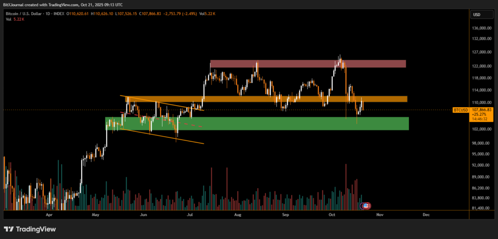 In summary, Bitcoin’s current dip reflects technical consolidation rather than panic—but the risk of a deeper correction grows if the $107K area fails to hold.